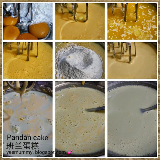 3. Melt the butter and set aside to cool slightly. Warm the pandan fresh milk and coconut milk together to lukewarm and set aside.